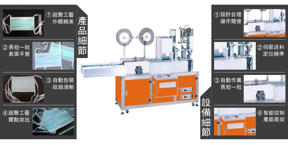 “鴻達口罩綁帶包裝機,是利瀚企業熟練掌握口罩生產工藝后, 根據客戶要求, 在國內研發成功且國外市場買點特別突出的全自動口罩綁帶包裝機,本機自動化程度高,主體采用優質鋁合金材料,外觀精美。面板采用硬化處理,PLC微電腦控制,自動張力控制系統,運行更加穩定。特殊的制作工藝確保在綁帶口罩包裝時,邊角紋路清晰、均勻、效率高。