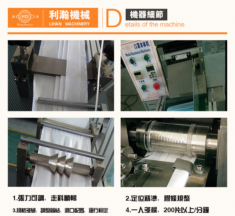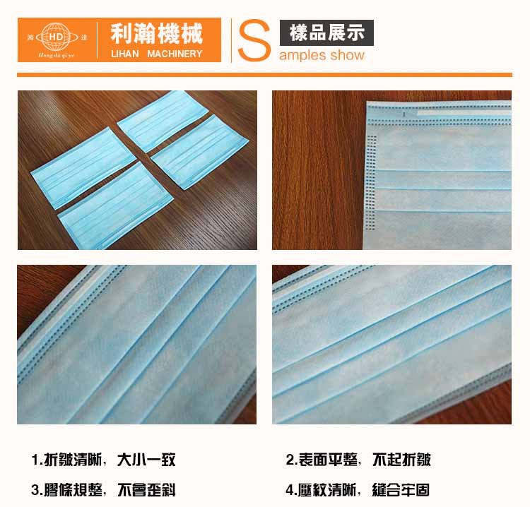 該機是利瀚企業依據不同客戶需求而規劃的一款較為實用型的口罩本體設備,本機自動化程度高, 出片速度快,打片巨細均勻,鼻梁條出位居中且不傷料,然后有用的確保了生產出的口罩質量。