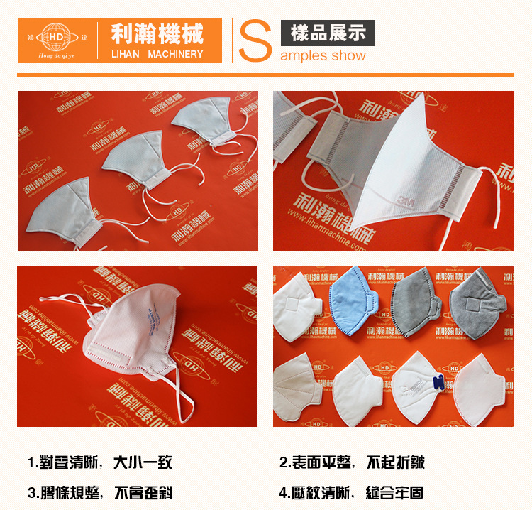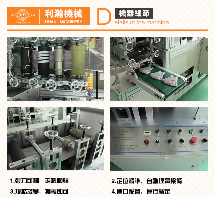 本機為自動化之含有濾布層的立體口罩制作機,從原資料入料到制品的完結均為一條線自動化作業;產能達40-80片/每分鐘;可簡潔替換刀輪及熔接輪以出產不同尺度及類型的立體口罩。所出產的口罩耳使佩帶者耳部舒適,無壓力,口罩濾布層過濾作用杰出,可適用于高污染工業