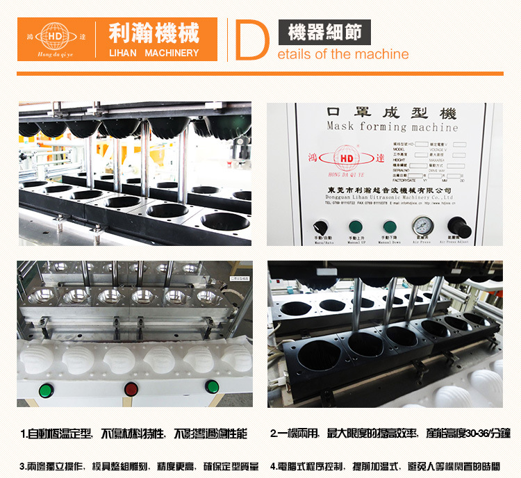 2.操作簡練,特性操作,便利易用,人員自定(可根據需求出產多種組合設備)可一次 成型一至四層高規范口罩,定型速度快,工藝先進,處理了傳統的粘模問題。