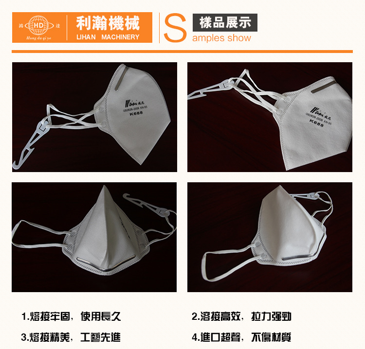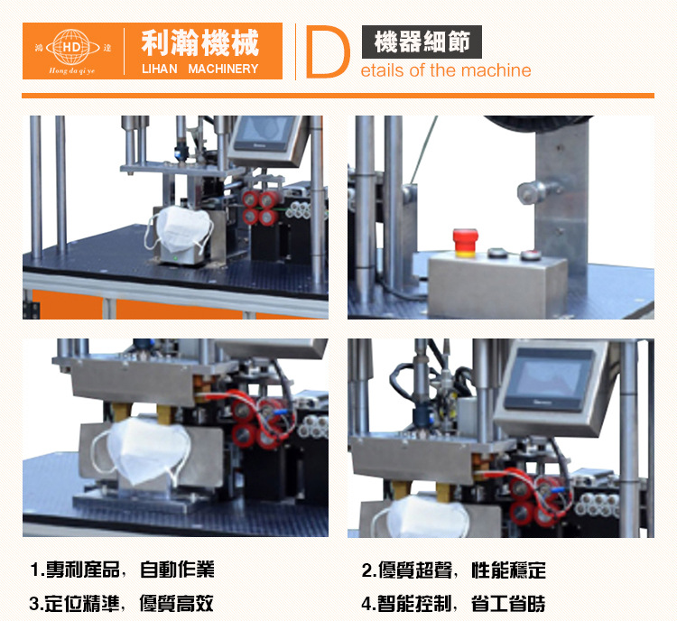 “鴻達”牌口罩外置鼻線熔接機是利瀚專為口罩貼鋁條而規劃的新產品,該設備是使用程序控制完結主動化出產,從鼻線進入、主動剪切、恒溫熱壓貼條均為主動化作業。制品外觀精巧,貼條結實,產能高效。
