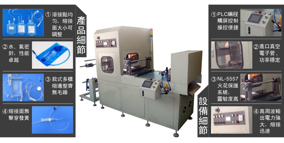 利瀚企業是一家長期致力于高周波塑膠熔接機械設備生產的高技術企業,公司于1993年在國家工商總局注冊的 “鴻達”牌8kw醫療用品袋高周波制袋機是利瀚機械為提高環保理念而設計出的新產品,是醫用輸液袋、醫用輸血袋、醫用導尿袋、沖洗袋、引流袋等一次性醫療用品袋的導管焊接專用設備,它是利用高頻電場使塑料內部分子振蕩產生熱能而進行各類制品熔合,周率穩定。本機振蕩周率采用國際工業波段27.12MHz或40.68MHz,輸出周率穩定,符合國際標準,適合各地使用。8kw醫療用品袋高周波制袋機是醫用輸液袋、醫用輸血袋、醫用導尿袋、沖洗袋、引流袋等一次性醫療用品袋的專用理想設備。“鴻達”牌商標,是行業內知名品牌,享譽全球;企業經過數十年的設計、專業技術開發和實踐,研發出行業內技術領先的8kw醫療用品袋高周波制袋機;隨著技術的革新與突破,能為廣大客戶量身定制各種規格的高周波專用設備。