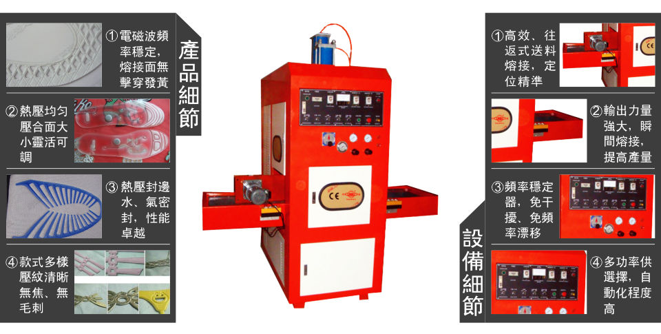 6、自動滑臺式高周波熔斷機振蕩頻率符合國際工業(yè)波段標(biāo)準(zhǔn),由高Q值真空電子管自激振蕩器產(chǎn)生高頻電磁場,使加工塑膠在上下電極間的高頻電場內(nèi),使其分子產(chǎn)生劇烈運動摩擦,在模具的壓力下得到其熔接效果。高周波熔斷機采用H型龍門結(jié)構(gòu),左右雙向自動滑臺,往返連續(xù)推送模具,運行高效。