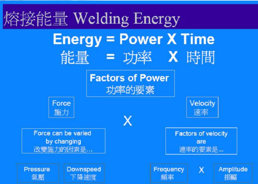超聲波熔接裝置是通過一個電晶體功能設備將當前50/60Hz的電頻轉變成20KHz或40KHz的電能高頻電能,供應給轉換器。轉換器將電能轉換成用于超聲波的機械振動能,調壓裝置負責傳輸轉變后的機械能至超聲波熔接機的焊頭。焊頭是將機械振動能直接傳輸至需壓合產品的一種聲學裝置!! 振動通過焊接工作件傳給粘合面振動磨擦產生熱能使塑膠熔化, 振動會在熔融狀態物質到達其介面時停止,短暫保持壓力可以使熔化物在粘合面固化時產生個強分子鍵, 整個周期通常是不到一秒種便完成,但是其焊接強度卻接近是一塊連著的材料。 如下圖所示,振動能量從焊頭傳遞到工件,工件之間的摩擦產生的熱量將工件熔接面熔化,從而焊接成一體。