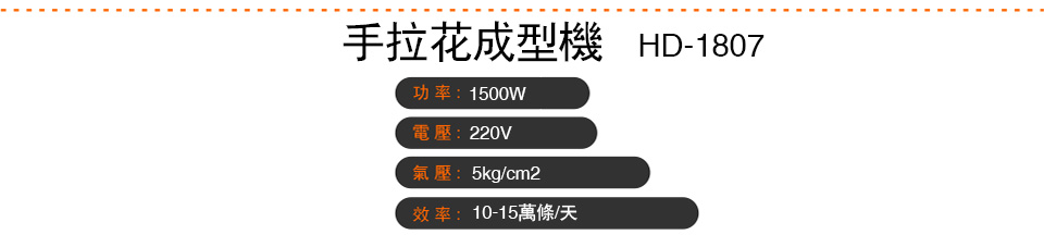 產品型號: HD-1807 編號描述: 手拉花成型機 適合行業: 產品描述: “鴻達”牌全自動手拉花成型機是制花飾品的理想選擇.設備性能穩定,可根據客戶所需要替換各式圖形的花輪,制造時不需預熱,并可連續操作。具備壓花效率高,圖案清晰不變形,易操作等特點. 立即咨詢