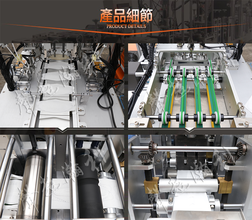 1.本機自動化作業(yè),原材料進料、自動出片、自動定位、自動耳帶焊接,焊點結(jié)實,口罩外形美觀,切邊均勻;